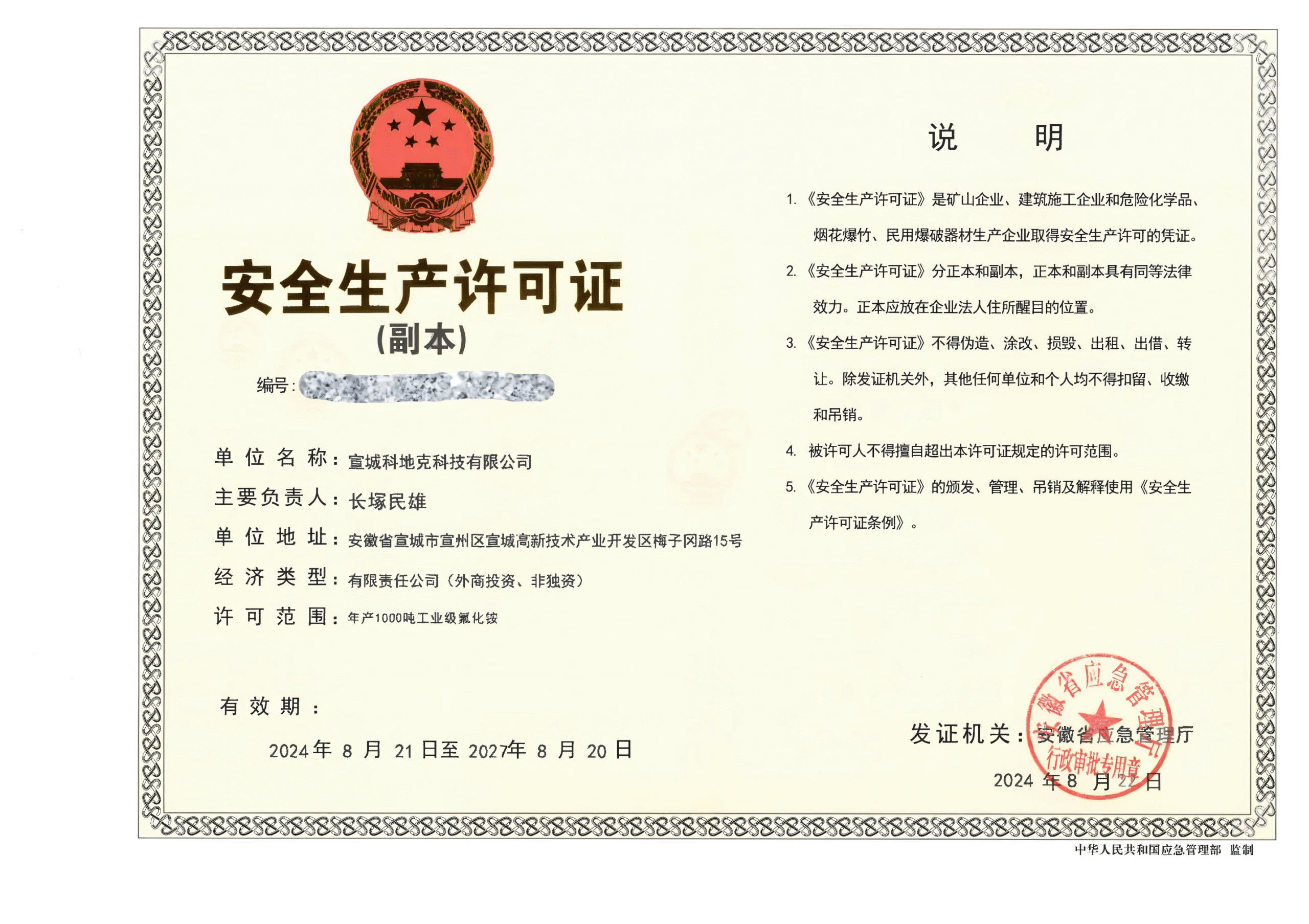 宣城科地克科技有限公司是由日本上市公司关东电化工业株式会社于2020年1月7日成立的外资企业,生产规模为年产1700吨。主要生产氟化物等半导体芯片的前端材料。其中高纯度氟化铵、六氟化钨、六氟丁二烯和四氟化碳的生产属于高新技术领域,是国家重点鼓励投资的建设项目,也是开发区重点引进的外资企业。目前1期项目已基本完工,在进行设备安装调试,现已进行生产。 宣城科地克科技有限公司专注于氟化物的研发与生产,拥有先进的设备和成熟的技术团队,为客户提供高品质的氟化物解决方案。截止至2025年,我司的生产能力已达到新的高度,稳步满足国内外市场的需求。